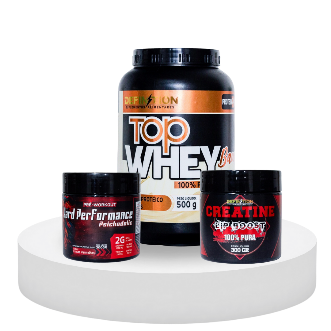 O Combo Ultra Definition reúne os três pilares para quem busca máxima performance nos treinos: Whey Protein 100% puro, Creatina 100% pura e Pré-Treino com alta potência. Ideal para quem deseja ganhar massa muscular, aumentar a força e ter mais energia e foco em treinos intensos.