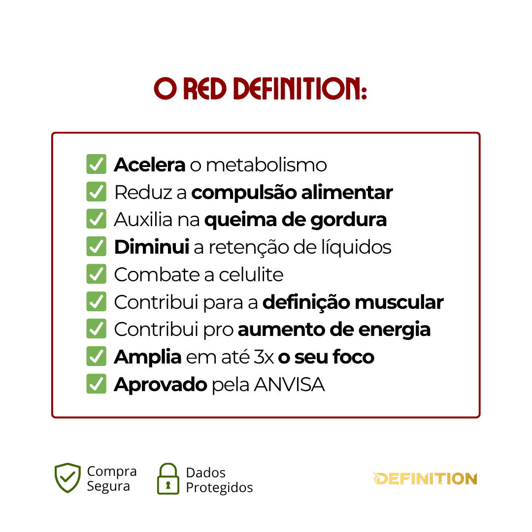 ⚡ Red Definition é um suplemento termogênico de alta performance, desenvolvido com ativos naturais que aceleram o metabolismo, reduzem a compulsão alimentar e ajudam a eliminar gordura de forma segura e eficaz.